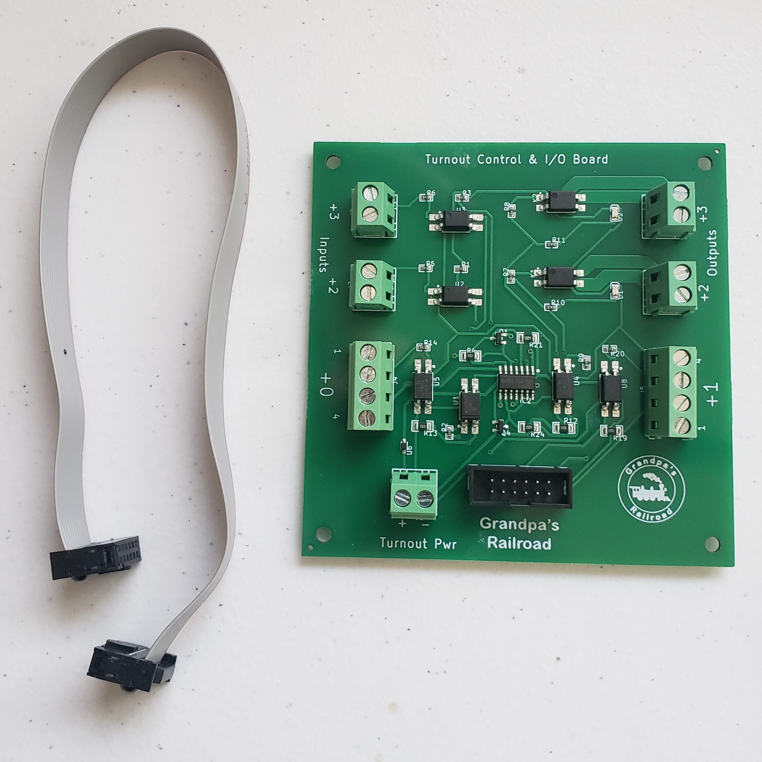 This Turnout Control & I/O Board can control up to 2 Servo Type turnout machines with feedback and has 2 Input Output connections.